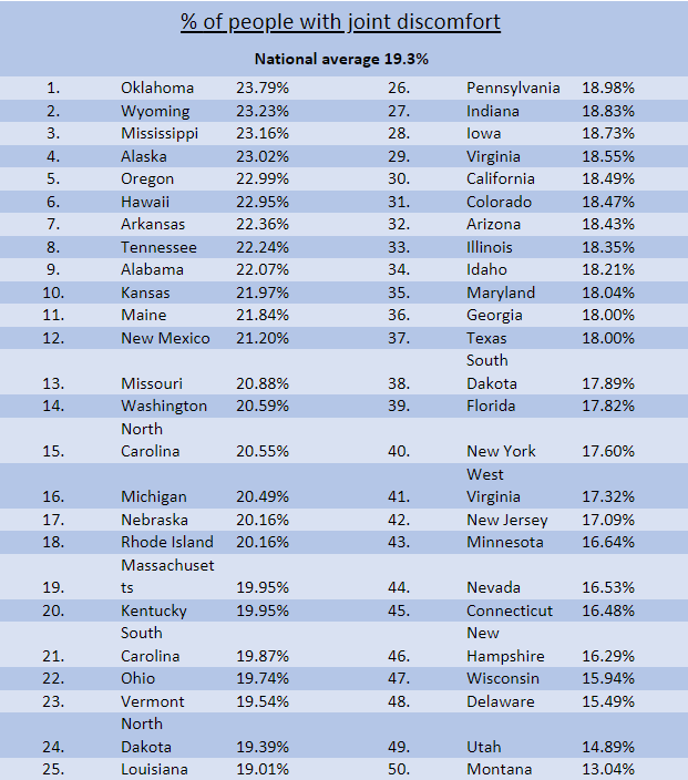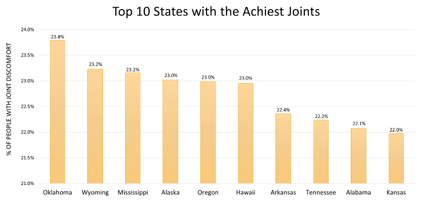 If you live in Montana, you may well be doing yoga into your golden years, as your state has the lowest proportion of people who report having achy joints (13.0%). Compare this to the much achier Oklahoma (23.8%) and Wyoming (23.2%). Here’s to you, Montana. Stay bendy!