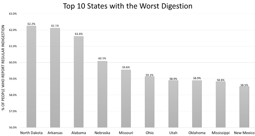 North Dakota leads the nation in the production of wheat and honey—but also in gut woes, with 62.2% of respondents from the state reporting regular indigestion. It’s closely followed by Arkansas (62.1%) and Alabama (61.6%). They’re in good company, though, as more than half of Americans (53.1%) say gut discomfort is an ongoing issue.