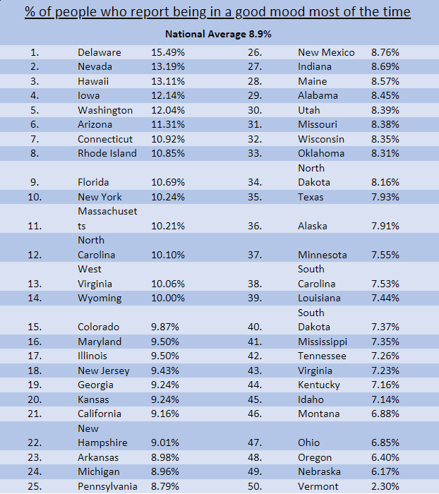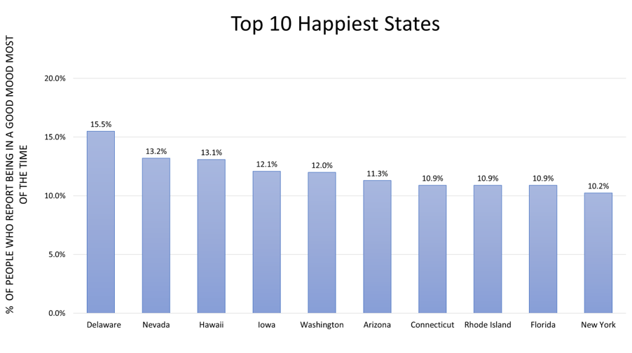 Which state has the happiest Americans? Delaware topped our rankings with 15.5% of people saying they’re in a good mood most of the time (peach pie makes us happy too!). The second happiest state is Nevada with 13.2% and Hawaii is in third with 13.1%.