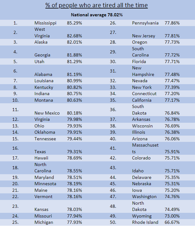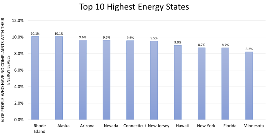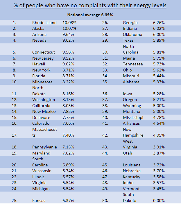 Believe it or not, the most bright-eyed and bushy-tailed Americans live in our smallest and largest states. Rhode Island ranks first with about 10.1% of respondents and Alaska in second with 10.1% of respondents say they have no complaints about their energy levels. They’re doing just slightly better than the national average of 6.39%. (Yes, Americans have low energy, unfortunately!)