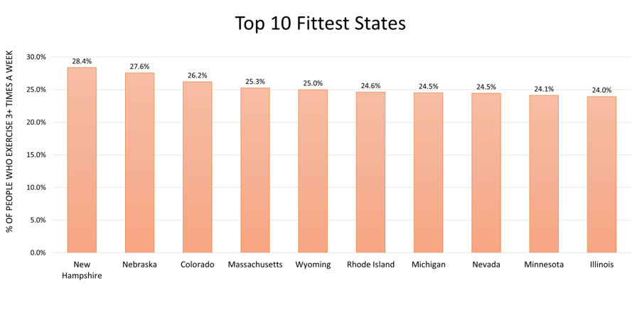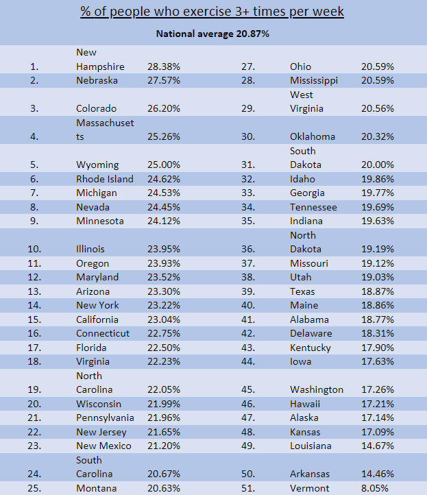 Maybe it’s their Live Free or Die ethos—or maybe it’s their year-round access to the great outdoors—but in New Hampshire, 28.4% of respondents say they exercise at least 3 times a week. The runners up in this category might also surprise you: Nebraska (27.6%) and Colorado (26.2%) round out the top three.