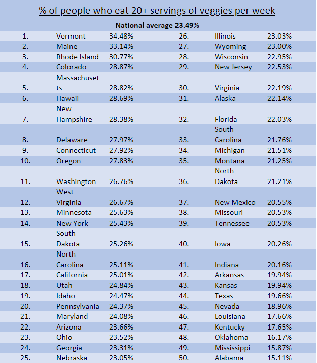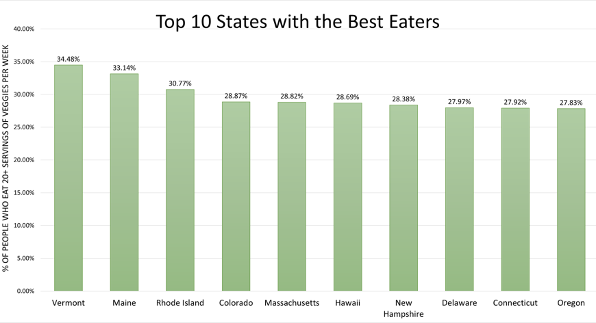 Fruits and veggies are a vital part of a balanced diet; they provide important vitamins, minerals and fiber to keep us healthy. Experts recommend that Americans eat 5 servings of fruits and vegetables per day, but according to our survey only about 23.4% of us are meeting this goal (yikes!). But while none of us are acing our eating habits, some states are doing better than others. Vermont and Maine are America’s best eaters, with 34.48% and 33.14% of people getting 20+ servings of fruits and veggies per week.