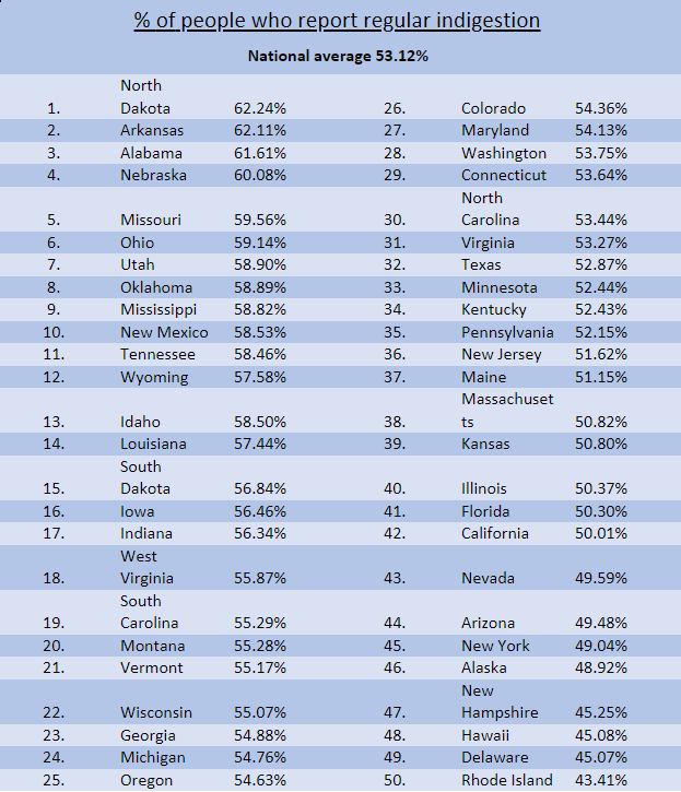 Rhode Island and Delaware’s guts are doing a little better than the rest of America, with 43.4% of Rhode Island and 45.07% of Delaware having digestion troubles.