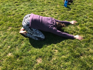 Start on your hands and knees, and spread your knees wide with your big toes touching. Reach your hands out forward with straight arms and send your hips back until they’re resting above your heels. If your hips feel tight, you can keep your legs closer together. Then, allow your forehead to come to the floor and keep your palms spread out facing down. And breathe: Take several rounds of deep inhales and exhales.