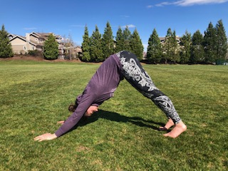 This pose is known as one of yoga’s staple poses. The easiest way to start is on your belly. Bring your hands right under your shoulders and your feet hip-width apart. Push yourself into a high plank (you can use your knees to assist you with this) and move your hips all the way up and back until your arms and legs are straight. Spread your fingers wide, and make sure your back is straight. If your hamstrings feel tight, a slight bend in your knee can help.