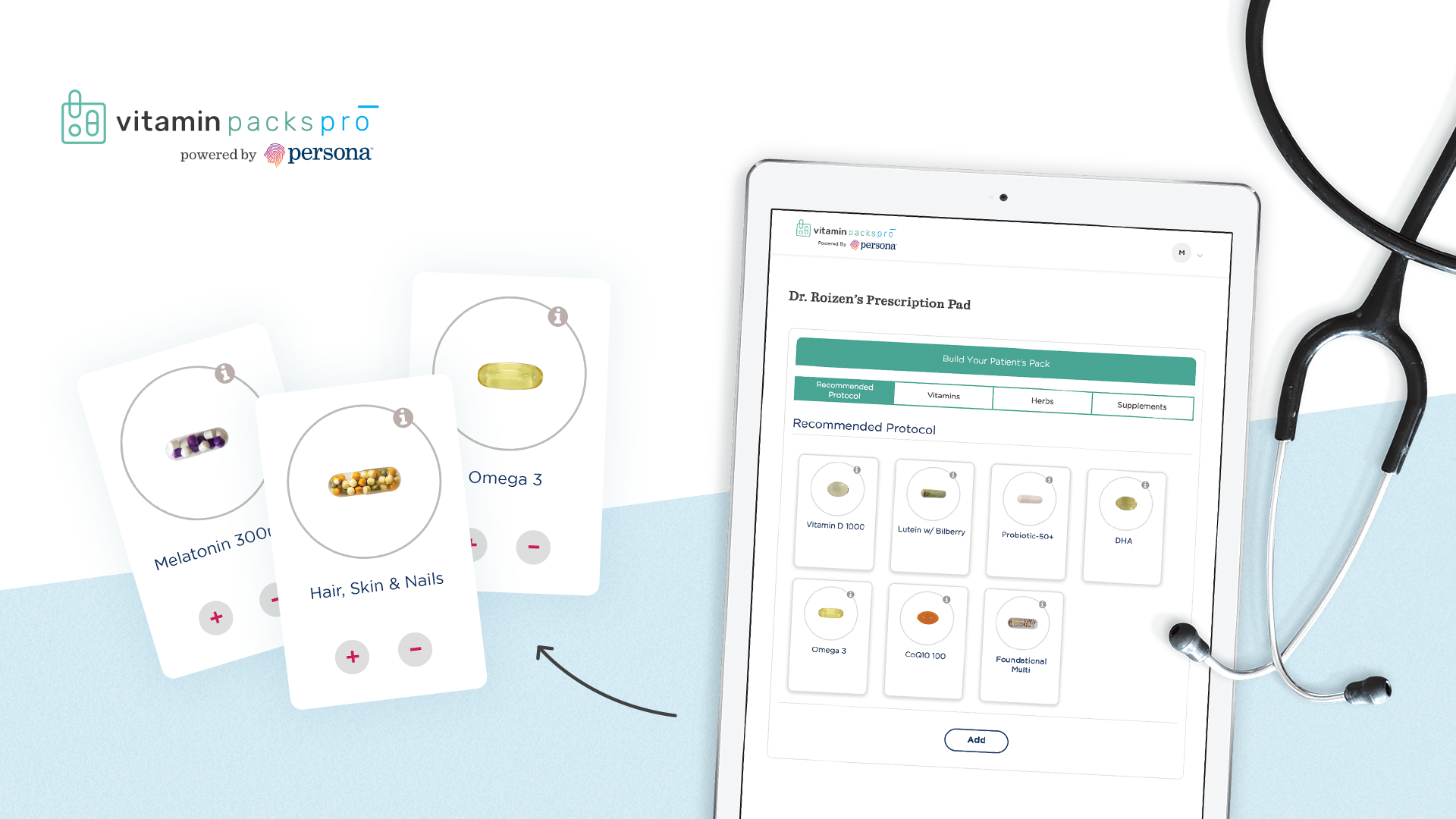 Through its new portal, Persona is creating an unparalleled platform - giving medical professionals a tool to create or review vitamin and supplement recommendations for their patients. The first of its kind, Vitamin Packs Pro, seamlessly integrates vitamin and supplement regimes for the physician and the patient. Practitioners log into a personalized dashboard to guide patients through Persona's established nutritional assessment or input custom vitamin and supplement recommendations through the Prescription Pad app. Both modes retain Persona's unique drug-nutrient interaction identification.